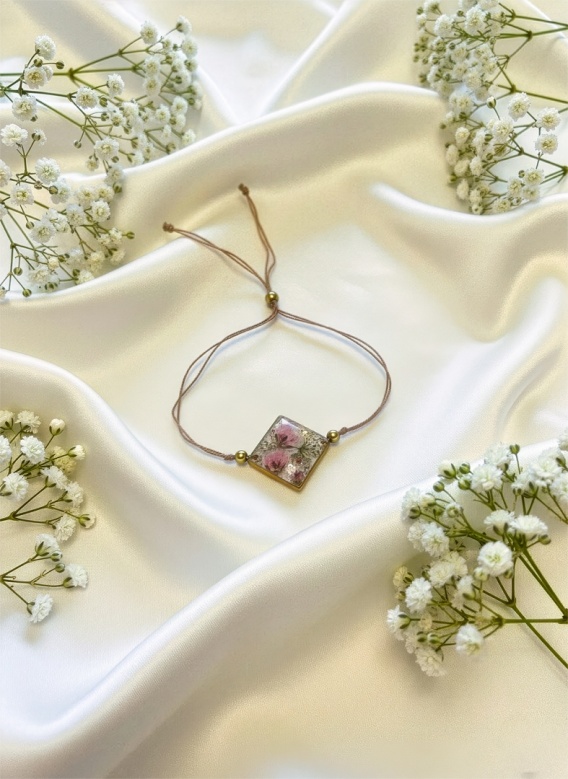 Ręcznie robiona bransoletka na beżowym jedwabnym sznurku z zatopionymi kwiatami gipsówki i dzikiej marchwi to wyjątkowy dodatek dla kobiet, które cenią naturalną elegancję i unikalny charakter biżuterii tworzonej z prawdziwych roślin. Każdy element został wykonany ręcznie, dzięki czemu każda bransoletka jest absolutnie niepowtarzalna — różni się układem kwiatów i subtelnymi detalami zamkniętymi w żywicy.
