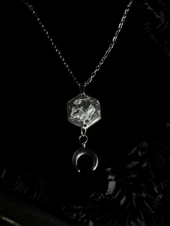 Centralnym punktem naszyjnika jest sześciokątny medalion z żywicy epoksydowej, wykonany ręcznie z dbałością o każdy detal. Jego lekko lodowa, krystaliczna struktura przywodzi na myśl fragment galaktycznego pyłu lub zamrożonego meteorytu. Subtelne refleksy światła nadają mu głębi i sprawiają, że naszyjnik prezentuje się efektownie zarówno na co dzień, jak i przy bardziej wyrazistych stylizacjach.