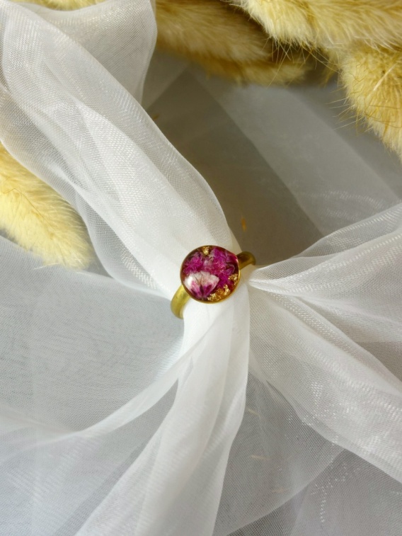 Regulowany pierścionek z różowymi gipsówkami – pozłacany